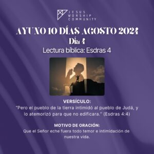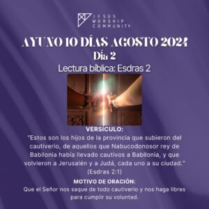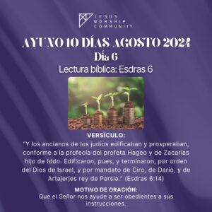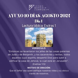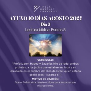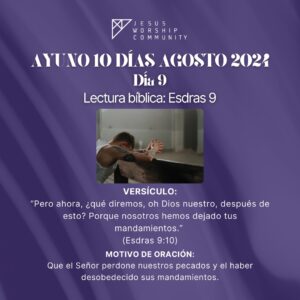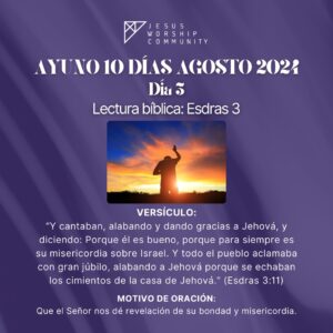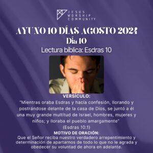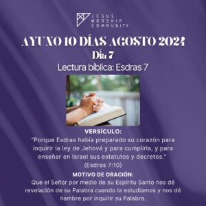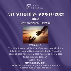 El ayuno comienza el Jueves 8 de Agosto a las 6:00 AM en la oración de la mañana y terminará a las 3:00 PM y continuará durante 10 días (cada día 9 horas) hasta el Sábado 17 de Agosto finalizando a las 3:00 PM. La oración de la mañana la realizamos por zoom ID 83191120604.